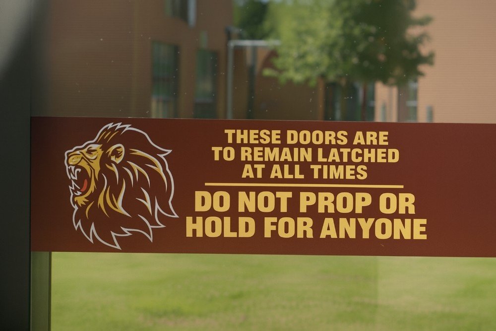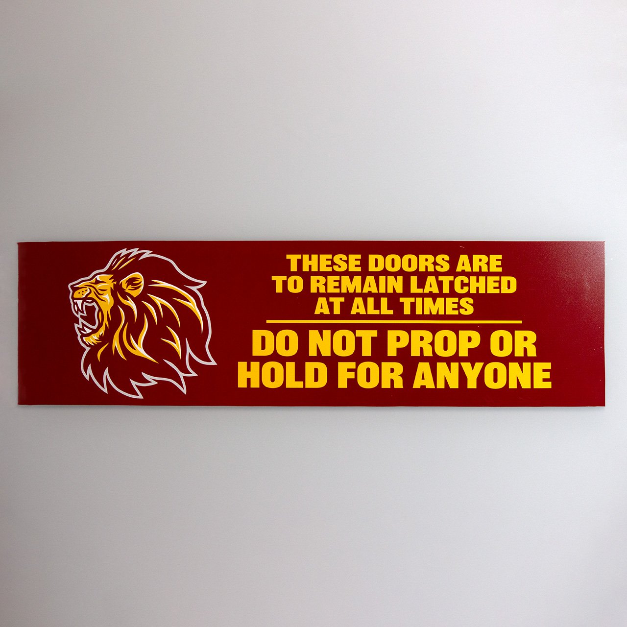While the interior banners could read: “THESE DOORS ARE TO REMAIN LATCHED AT ALL TIMES. DO NOT PROP OR HOLD FOR ANYONE”
