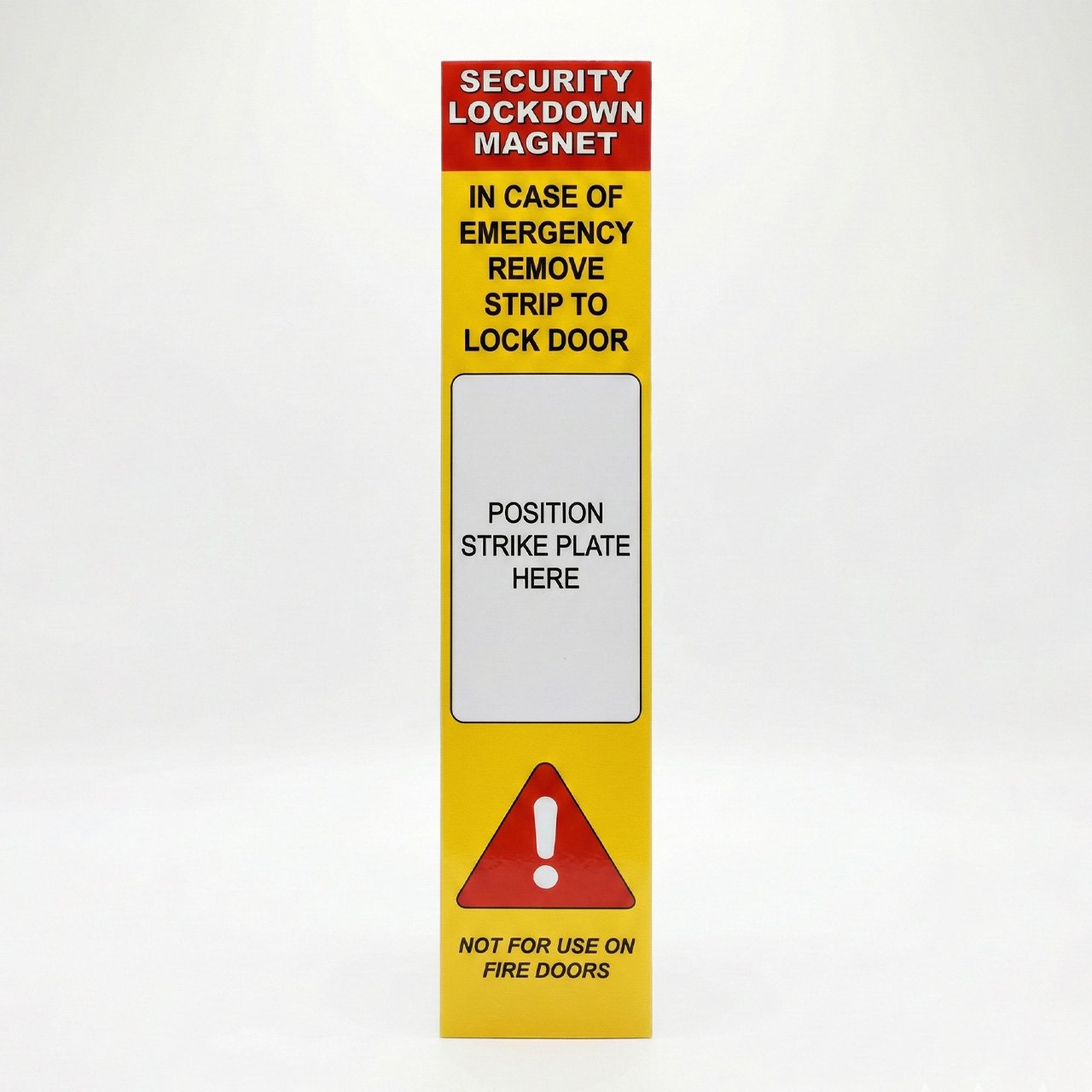 This high visibility safety device enables teachers to keep their classroom doors locked at all times without disrupting the flow of students. The magnet covers the strike plate, preventing the latch from engaging so the door can be pushed open. In an emergency, simply remove the strip and close the door—it locks instantly, securing the room in seconds without the need to hunt for keys in a panic.
